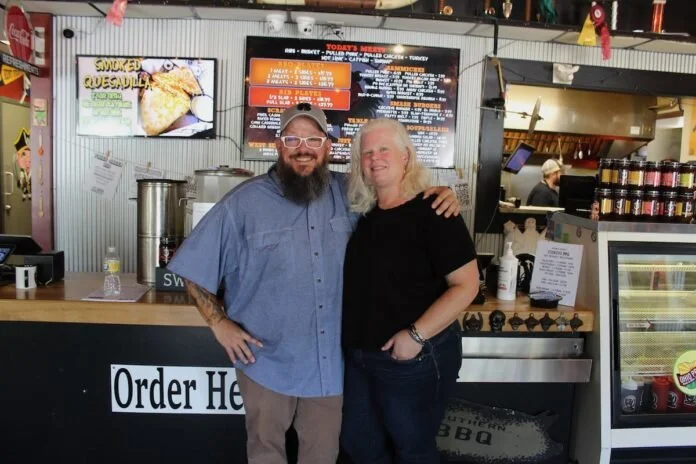 Erik Hoover and his wife, Stacey, stand in the entrance to Cockeye BBQ in Warren, Ohio, on Aug. 24. (Rachel Wagoner photo)
